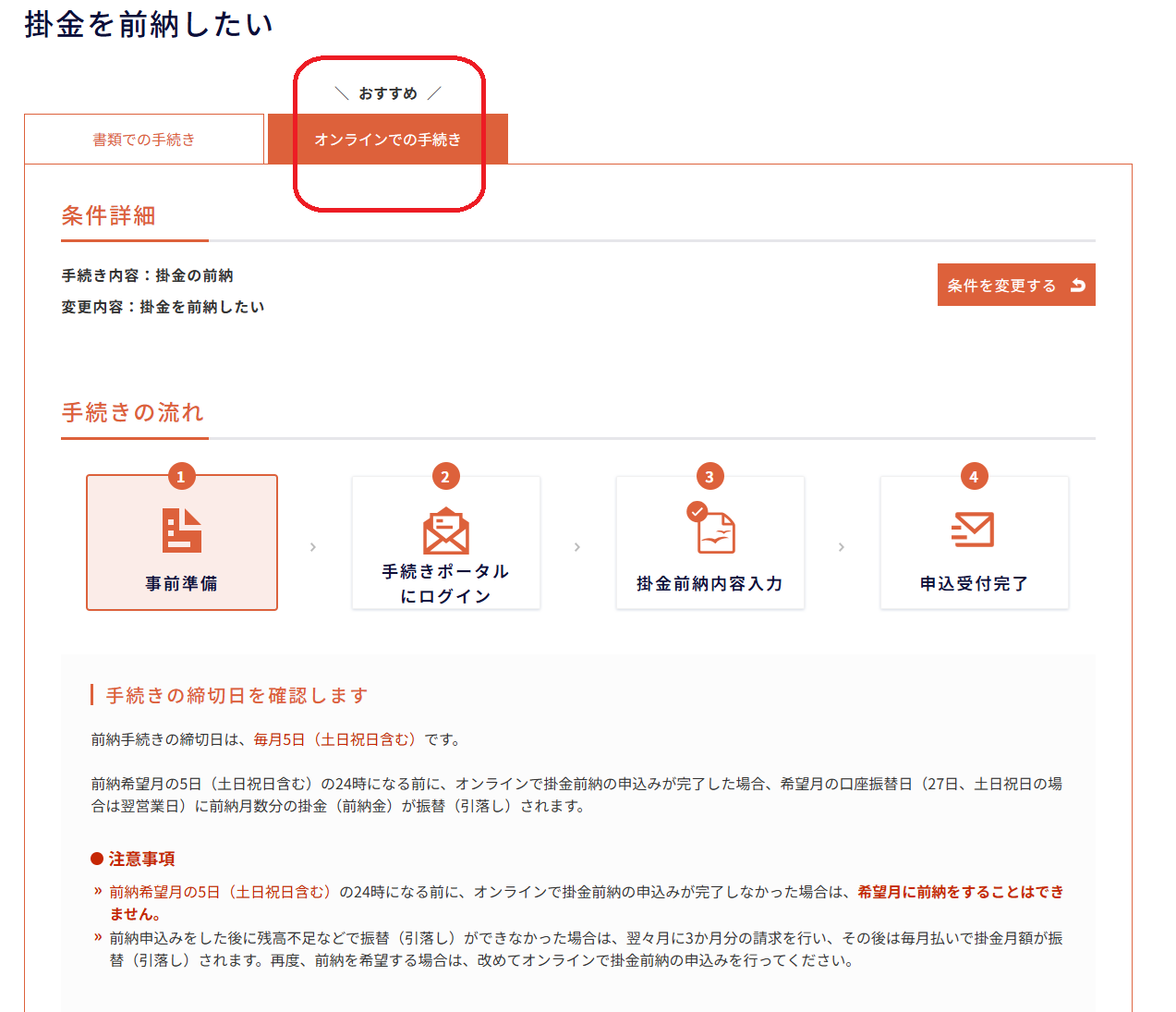 こちらの場合は、郵送と違って委託団体・取扱店をはさまないので、「前納希望月の5日(土日祝日の場合は翌営業日)の24時までに申込みが完了していればOKです。