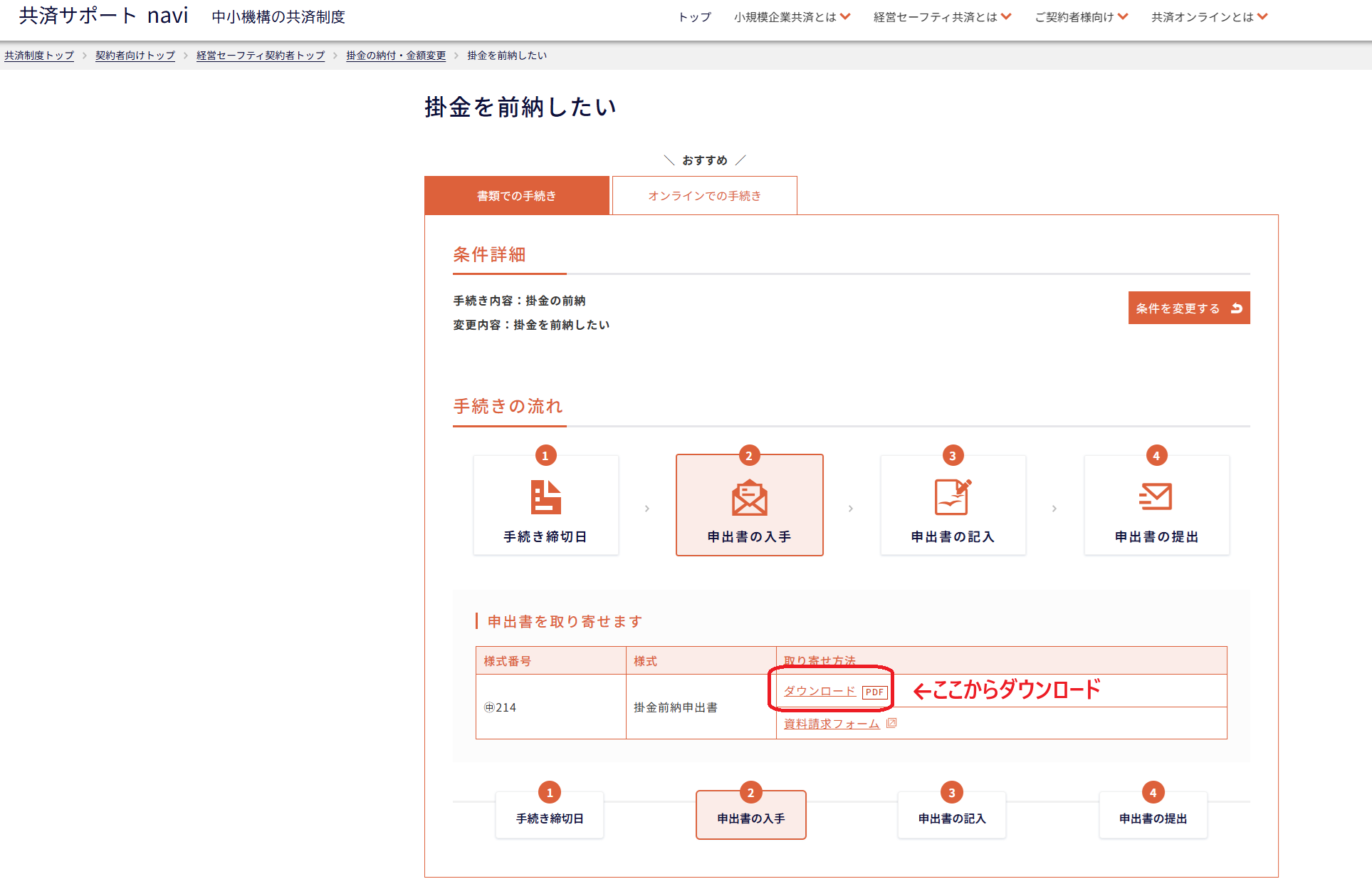 郵送の場合、まずは下記サイトから「掛金前納申出書」をダウンロードします。