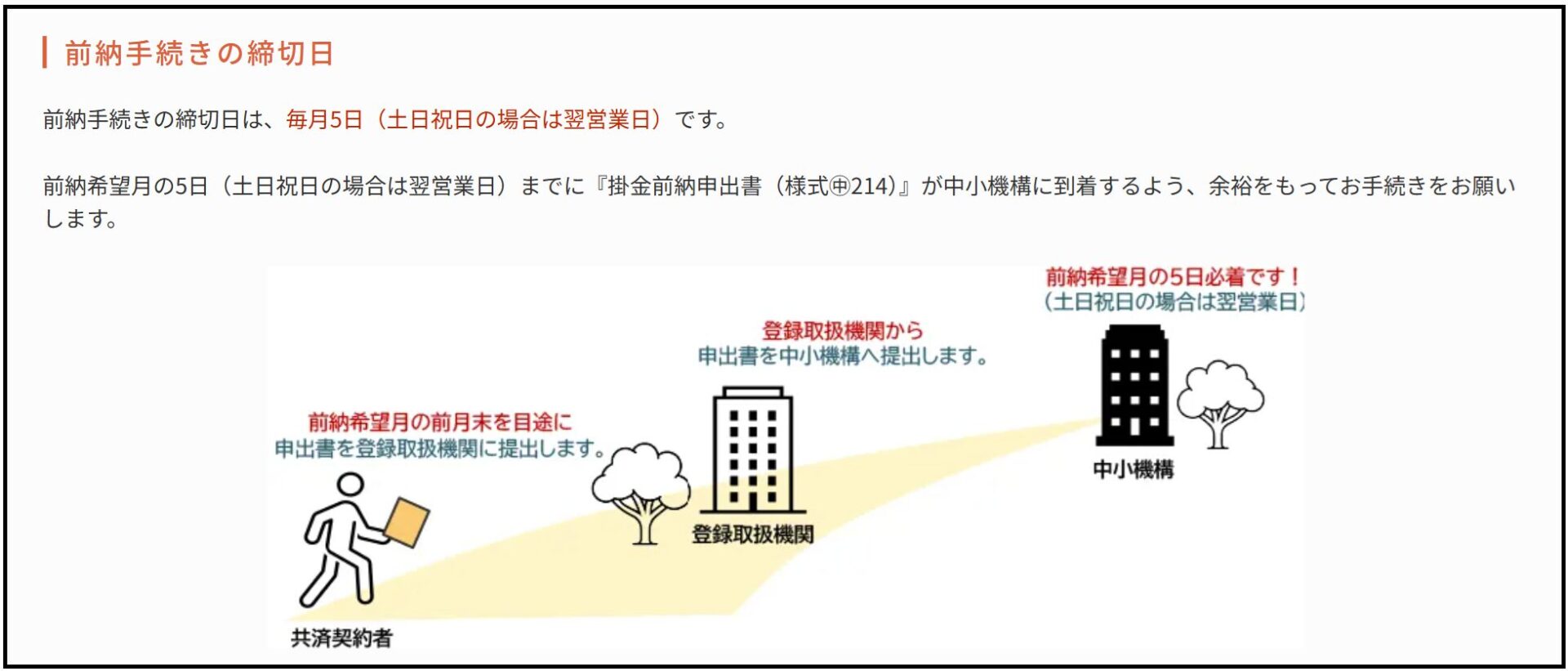 中小機構のHPでは「前納希望月の5日(土日祝日の場合は翌営業日)」と書かれているんですが、これは中小機構に到着する期限です。