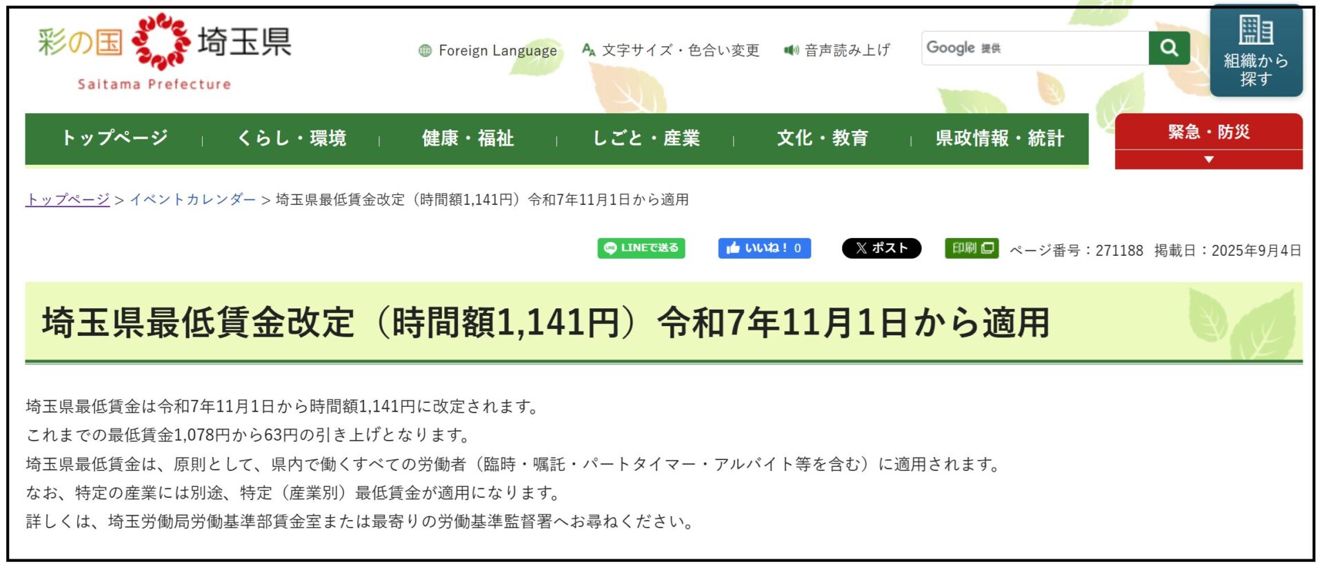 埼玉県の令和7年(2025年)9月現在の最低賃金は1,078円です。