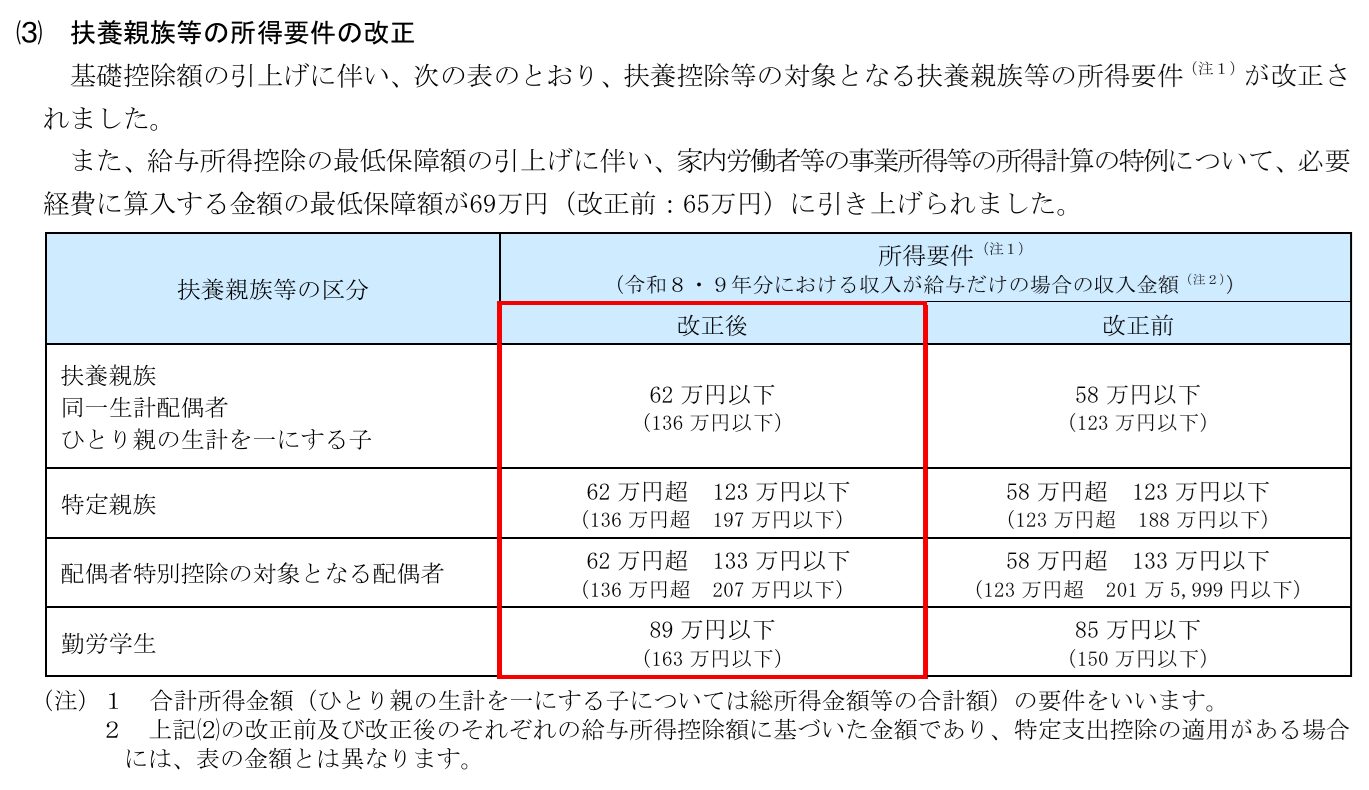 また、扶養親族等の所得要件も下記の通り改正されています。