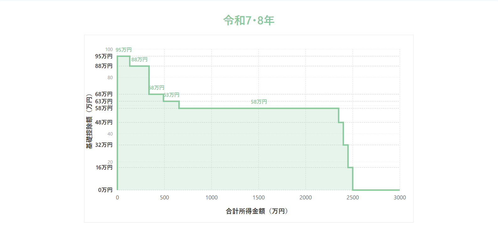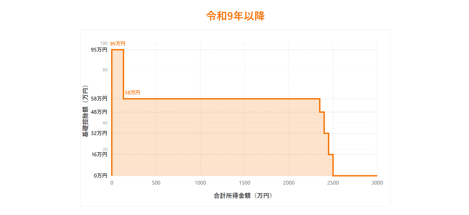 合計所得金額が2,350万円を超えると段階的に控除額が減少し、2,500万円を超えるとゼロ円となる点は、令和7年、8年(2025年、2026年)と同じです。