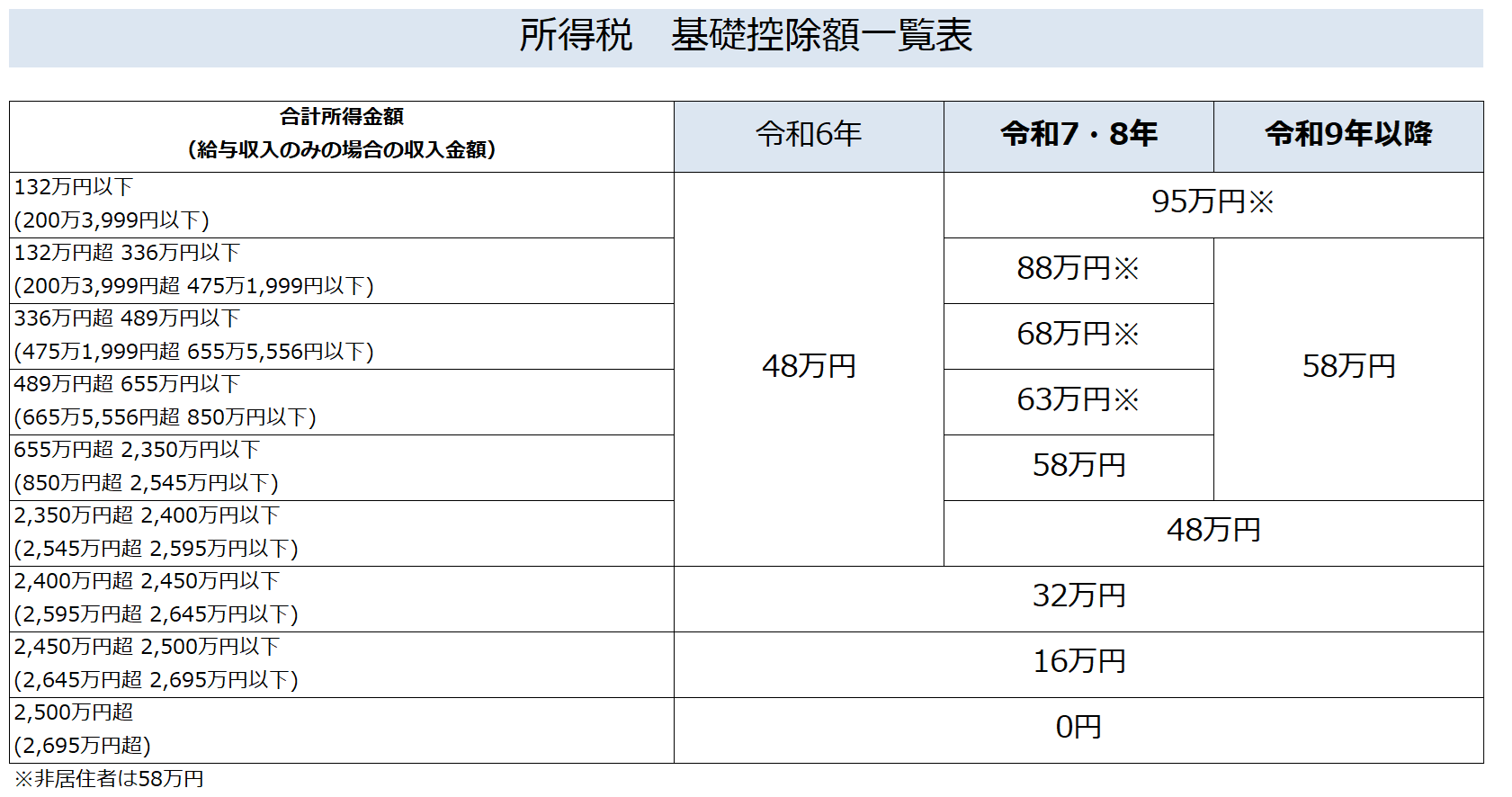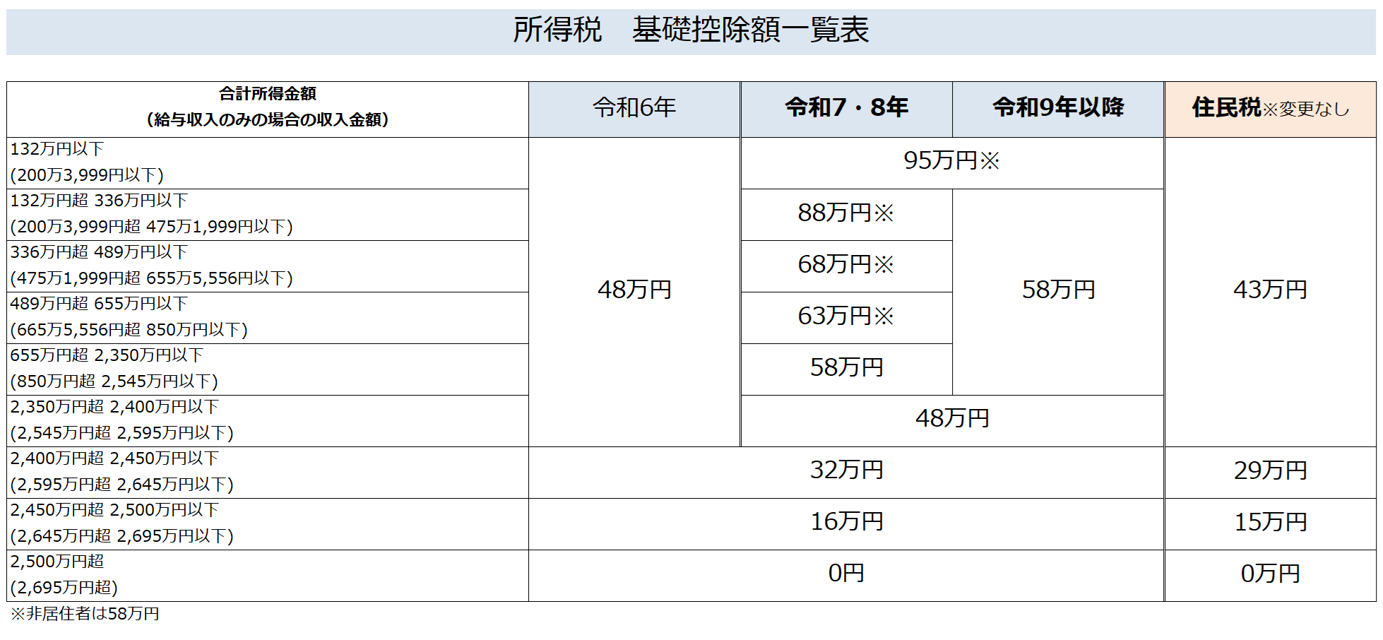 所得税の基礎控除額一覧表に住民税も付け加えたものがこちら↓