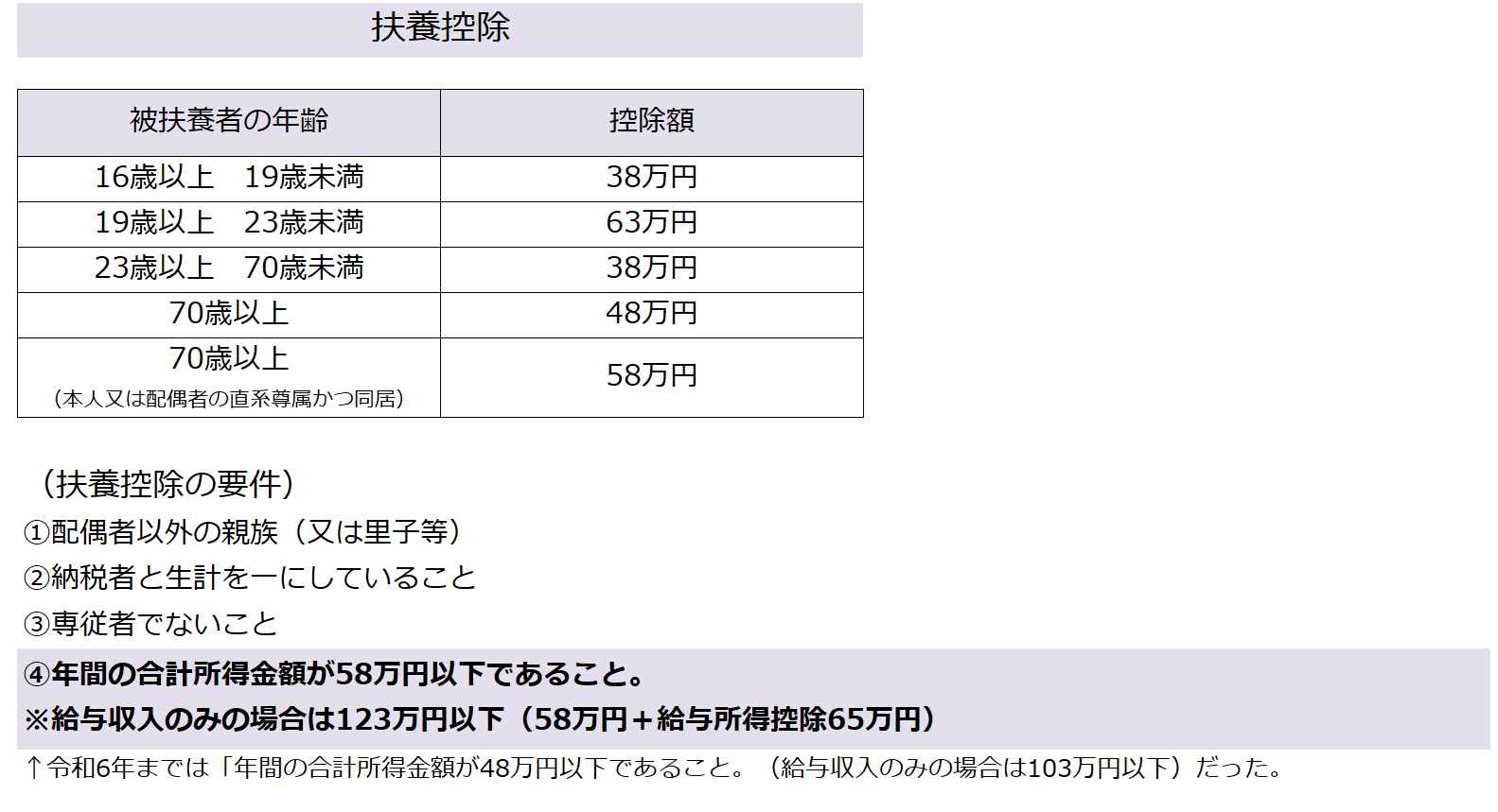 令和7年からはこの基準が引き上げられ、合計所得金額58万円以下(給与収入のみの場合は年収123万円以下)となります。