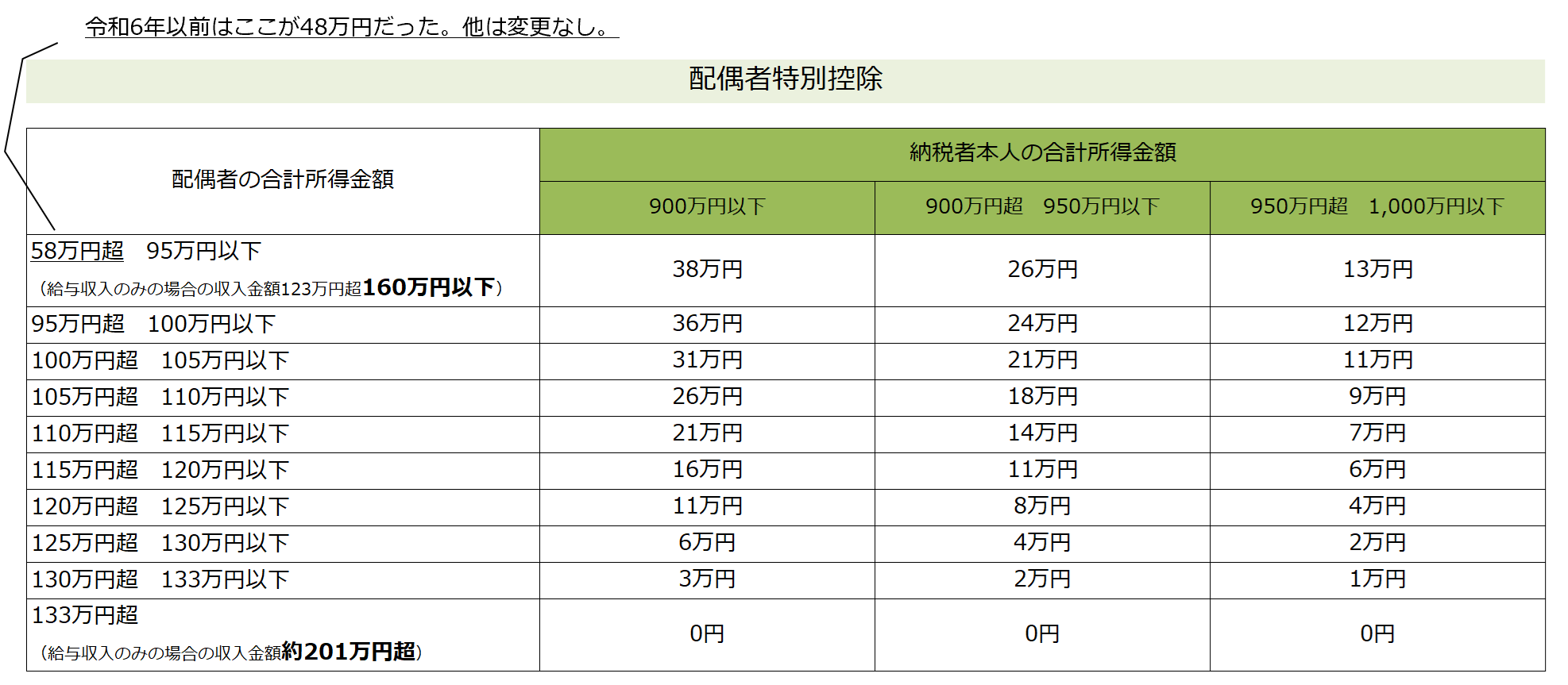 令和6年時点でも、年収150万円までであれば配偶者控除と同じ38万円の控除が受けられていました(納税者の合計所得金額900万円以下の場合)。