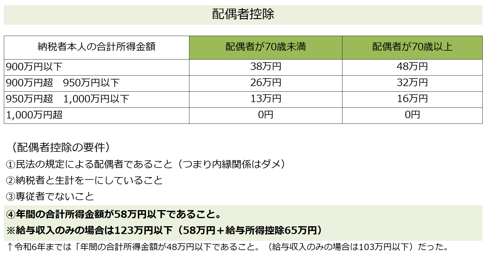 令和6年までは、合計所得金額48万円以下(給与収入のみの場合は年収103万円以下)の配偶者がいる場合に配偶者控除を受けることができました。