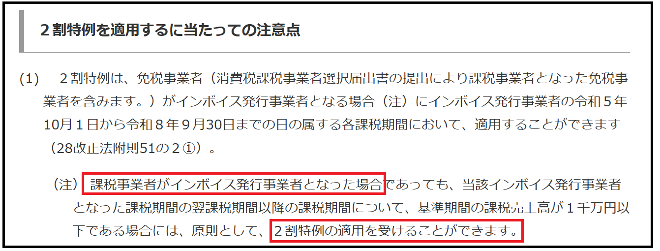 つまり、以前から課税事業者であった人でも、基準期間の課税売上高が1000万円以下であれば2割特例は使える、ということです。