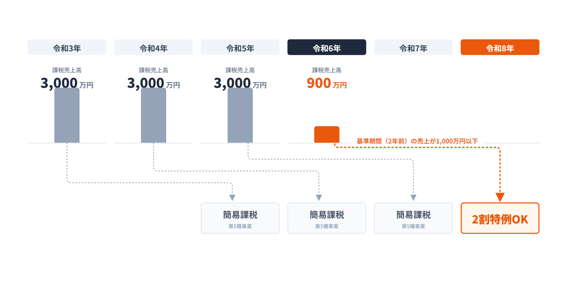 ずっと課税売上3,000万円前後で簡易課税制度の適用を受けていたけど、令和6年に売上が減り課税売上900万円になった。