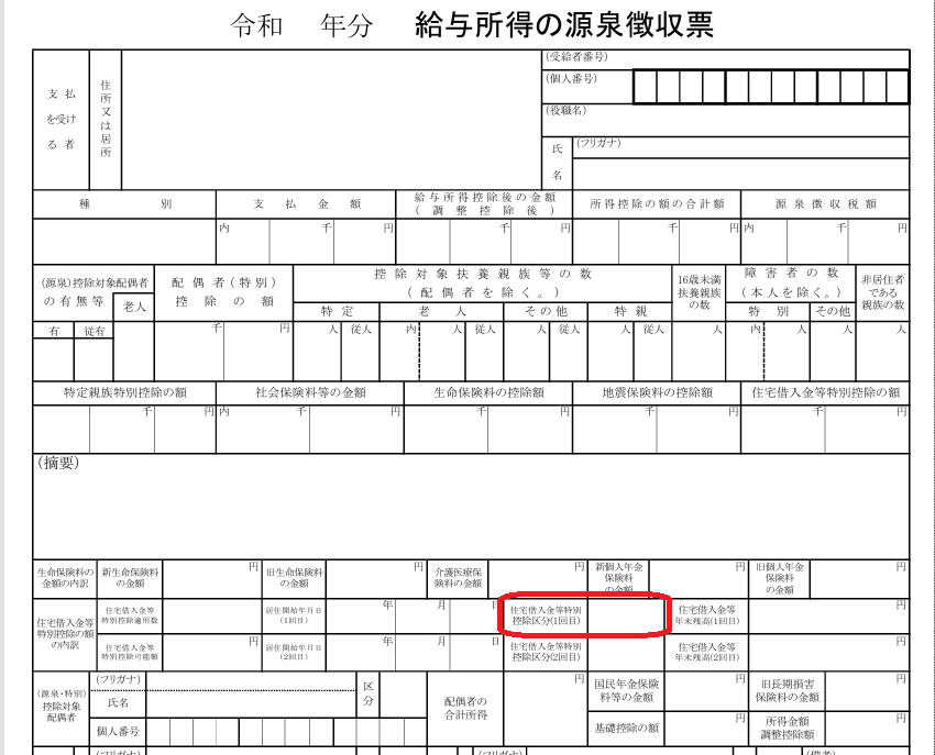 「住宅借入金等特別控除区分」は源泉徴収票の下記の赤丸部分に「住」とか「認」とか「住(特)」などと表示されます。