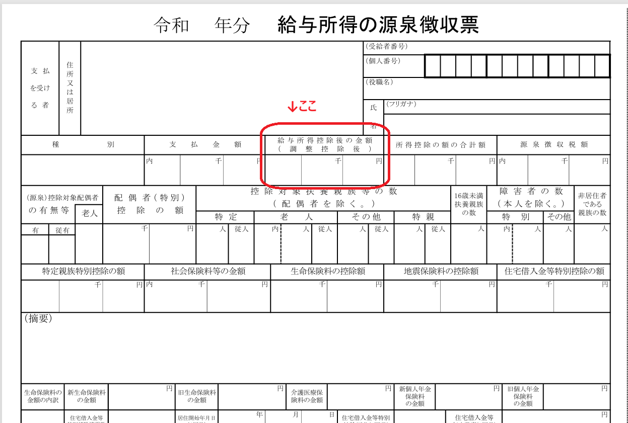 なお、中途退職や乙欄適用などで年末調整未済の場合、ここは空欄になります。